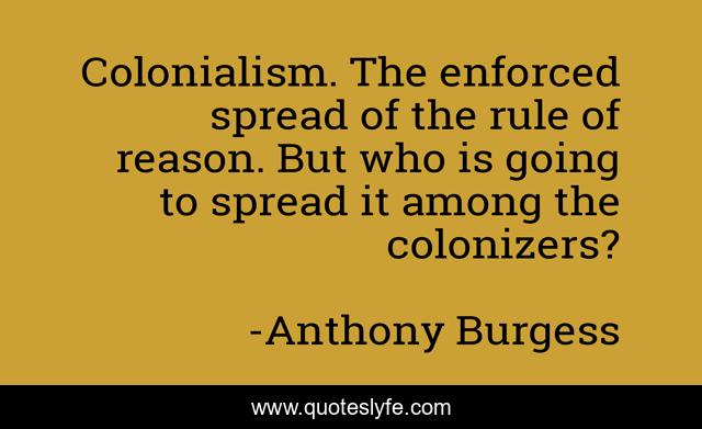This page presents the quote "Colonialism. The enforced spread of the rule of reason. But who is going to spread it among the colonizers?". Author of this quote is Anthony Burgess. This quote is about colonialism, reason, colonization,.
