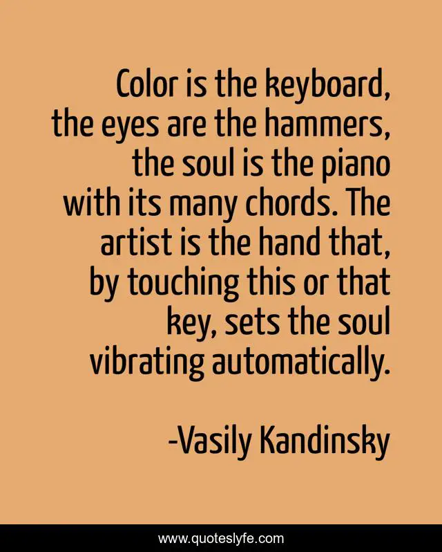 This page presents the quote "Color is the keyboard, the eyes are the hammers, the soul is the piano with its many chords. The artist is the hand that, by touching this or that key, sets the soul vibrating automatically.". Author of this quote is Vasily Kandinsky. .