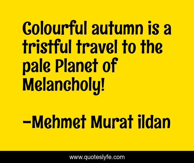 This page presents the quote "Colourful autumn is a tristful travel to the pale Planet of Melancholy!". Author of this quote is Mehmet Murat ildan. This quote is about autumn, melancholy, tristful, season, travel, ildan, planet, seasons, colourful,.