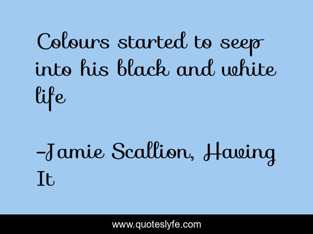 This page presents the quote "Colours started to seep into his black and white life". Author of this quote is Jamie Scallion, Having It. This quote is about love, young-adult-fiction, young-adult, affection,.