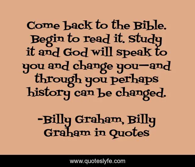This page presents the quote "Come back to the Bible. Begin to read it. Study it and God will speak to you and change you—and through you perhaps history can be changed.". Author of this quote is Billy Graham, Billy Graham in Quotes. This quote is about bible, billy-graham,.
