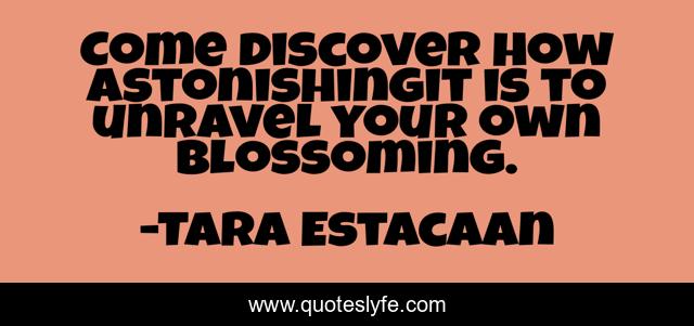 This page presents the quote "Come discover how astonishingit is to unravel your own blossoming.". Author of this quote is Tara Estacaan. This quote is about patience, life, blossoming, strength, women,.