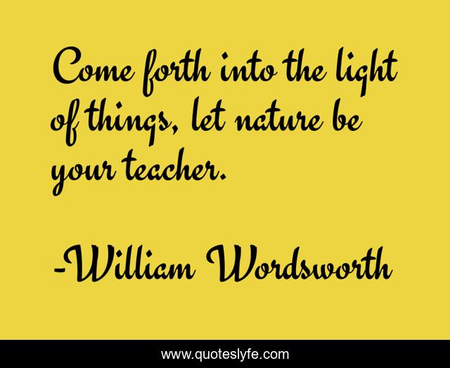 This page presents the quote "Come forth into the light of things, let nature be your teacher.". Author of this quote is William Wordsworth. This quote is about light, teacher, things,.