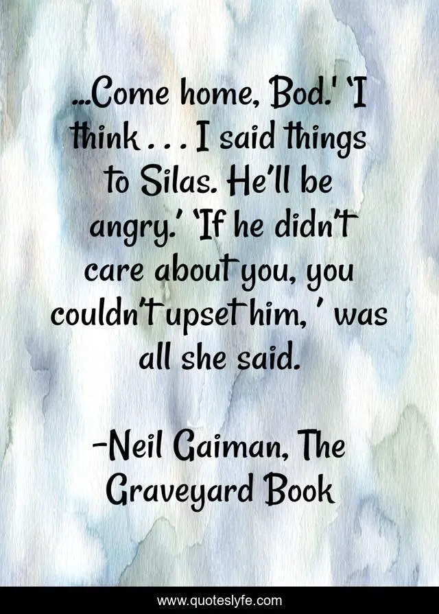 This page presents the quote "...Come home, Bod.' ‘I think . . . I said things to Silas. He’ll be angry.’ ‘If he didn’t care about you, you couldn’t upset him, ’ was all she said.". Author of this quote is Neil Gaiman, The Graveyard Book. This quote is about love, truth, affection, care,.