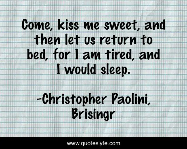 This page presents the quote "Come, kiss me sweet, and then let us return to bed, for I am tired, and I would sleep.". Author of this quote is Christopher Paolini, Brisingr. This quote is about fantasy, fiction,.