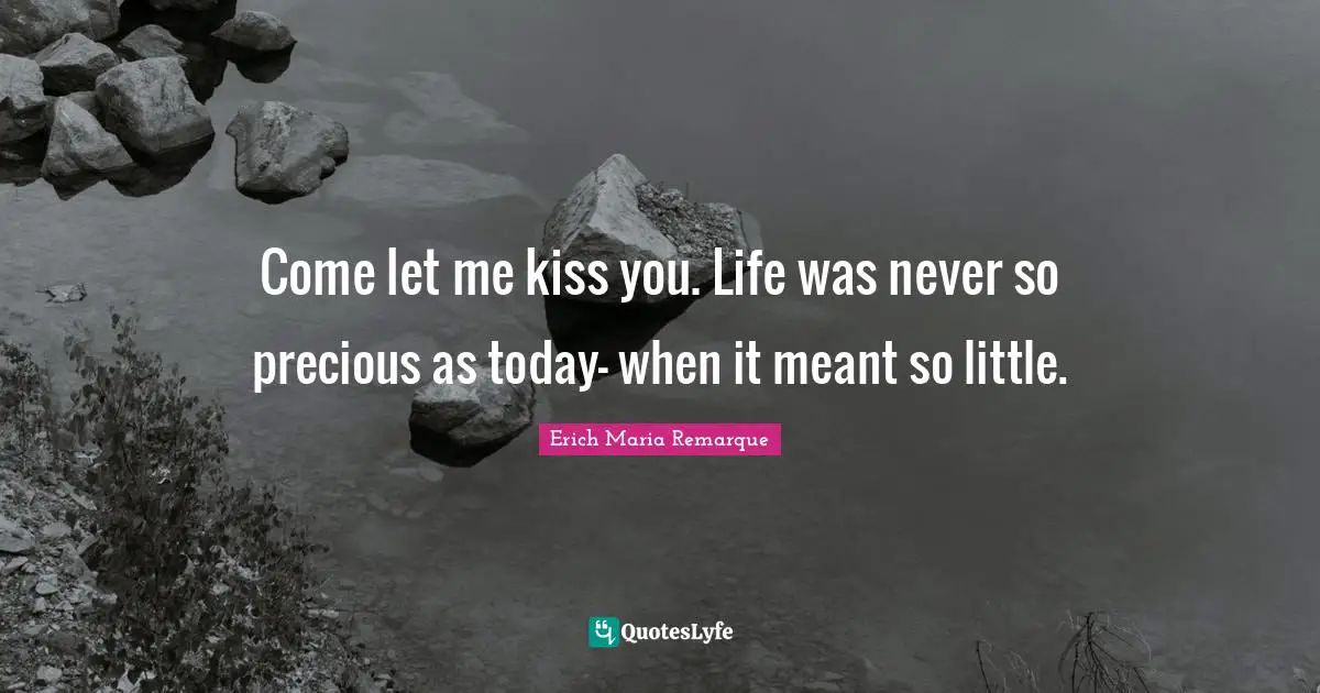 This page presents the quote "Come let me kiss you. Life was never so precious as today— when it meant so little.". Author of this quote is Erich Maria Remarque. This quote is about today, life, kissing, littles, let me,.