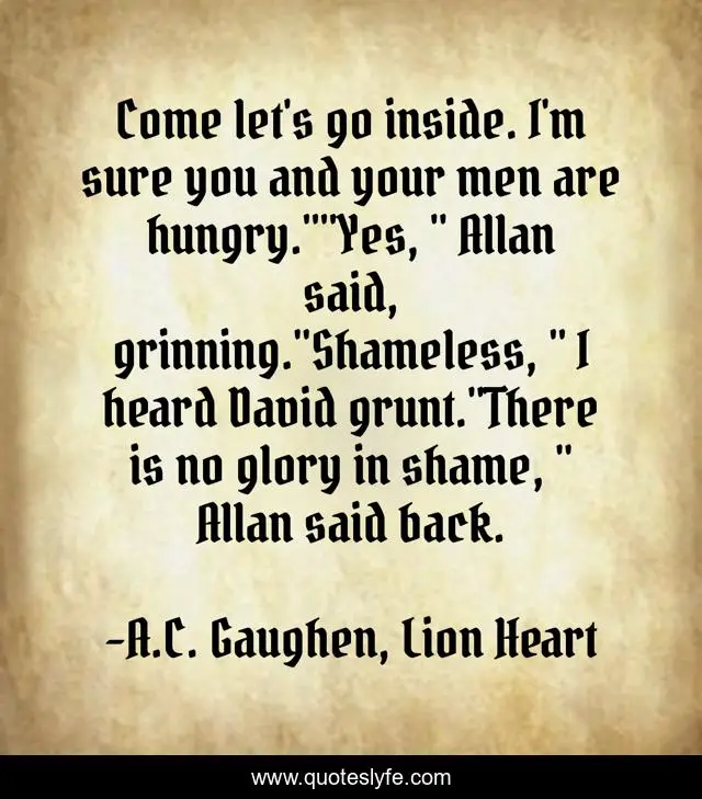 This page presents the quote "Come let's go inside. I'm sure you and your men are hungry.""Yes, " Allan said, grinning."Shameless, " I heard David grunt."There is no glory in shame, " Allan said back.". Author of this quote is A.C. Gaughen, Lion Heart. This quote is about shame, glory,.