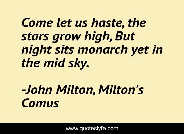 This page presents the quote "Come let us haste, the stars grow high, But night sits monarch yet in the mid sky.". Author of this quote is John Milton, Milton's Comus. This quote is about monarch, stars, night,.