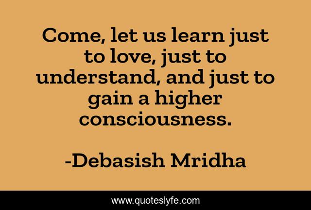 This page presents the quote "Come, let us learn just to love, just to understand, and just to gain a higher consciousness.". Author of this quote is Debasish Mridha. This quote is about love, consciousness, philosophy, debasish-mridha, quotes, inspirational, enthusiasm, learn-to-love, debasish-mridha-m-d,.