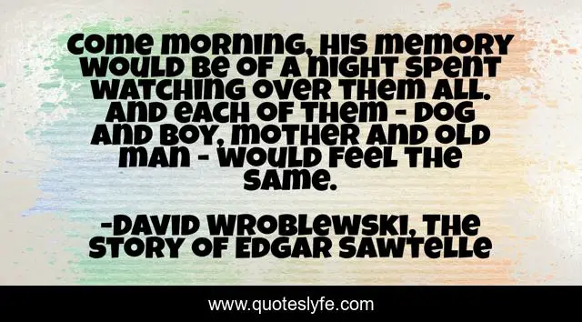 This page presents the quote "Come morning, his memory would be of a night spent watching over them all. And each of them - dog and boy, mother and old man - would feel the same.". Author of this quote is David Wroblewski, The Story of Edgar Sawtelle. This quote is about protection, animals, family,.