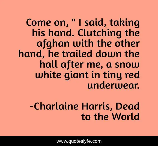 This page presents the quote "Come on, " I said, taking his hand. Clutching the afghan with the other hand, he trailed down the hall after me, a snow white giant in tiny red underwear.". Author of this quote is Charlaine Harris, Dead to the World. This quote is about eric-northman, funny, comedy, sookie-stackhouse, true-blood,.
