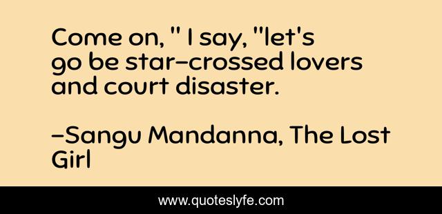 This page presents the quote "Come on, " I say, "let's go be star-crossed lovers and court disaster.". Author of this quote is Sangu Mandanna, The Lost Girl. This quote is about love, adventure, affection,.