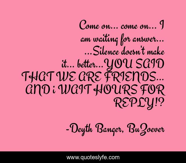 This page presents the quote "Come on... come on... I am waiting for answer... ...Silence doesn't make it... better...YOU SAID THAT WE ARE FRIENDS... AND i WAIT HOURS FOR REPLY!?". Author of this quote is Deyth Banger, BuZoever. This quote is about we, afraid, friends, said,.