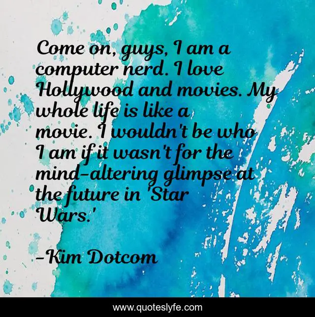 This page presents the quote "Come on, guys, I am a computer nerd. I love Hollywood and movies. My whole life is like a movie. I wouldn't be who I am if it wasn't for the mind-altering glimpse at the future in 'Star Wars.'". Author of this quote is Kim Dotcom. This quote is about life, future, love, affection,.
