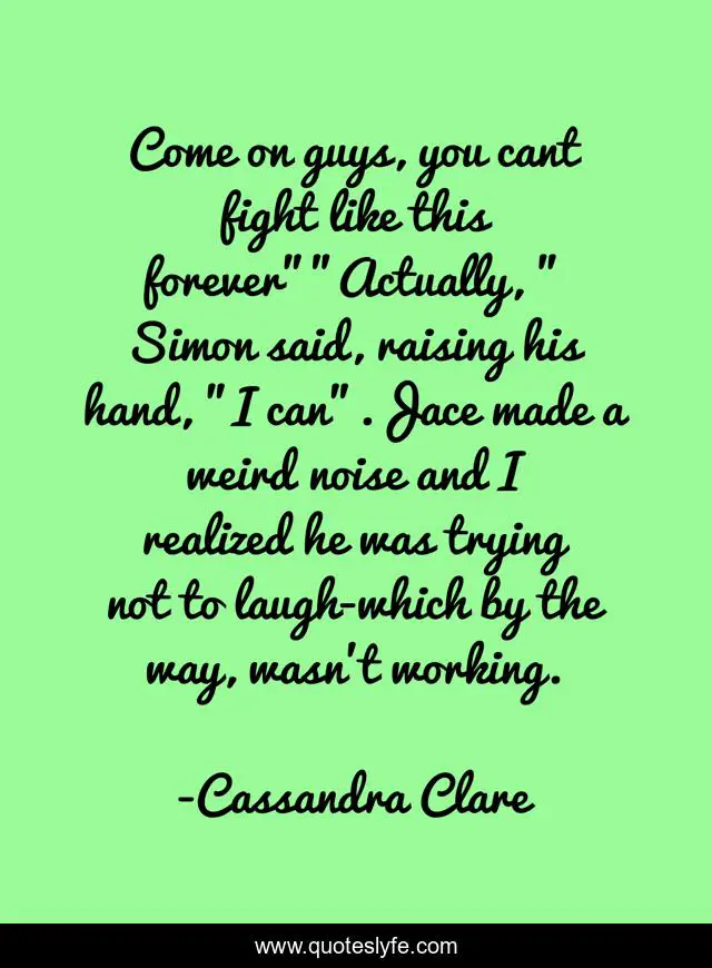 This page presents the quote "Come on guys, you cant fight like this forever""Actually, " Simon said, raising his hand, "I can".Jace made a weird noise and I realized he was trying not to laugh-which by the way, wasn't working.". Author of this quote is Cassandra Clare. This quote is about jace-wayland, humor, mortal-instruments, simon-lewis,.