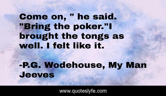 This page presents the quote "Come on, " he said. "Bring the poker."I brought the tongs as well. I felt like it.". Author of this quote is P.G. Wodehouse, My Man Jeeves. .