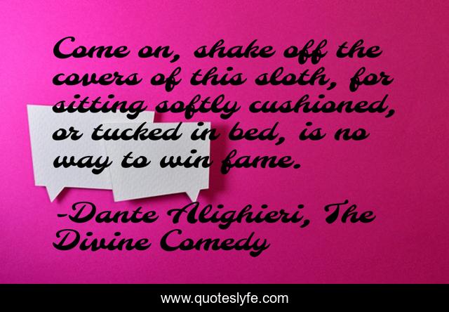 This page presents the quote "Come on, shake off the covers of this sloth, for sitting softly cushioned, or tucked in bed, is no way to win fame.". Author of this quote is Dante Alighieri, The Divine Comedy. This quote is about action, divine-comedy, dante,.