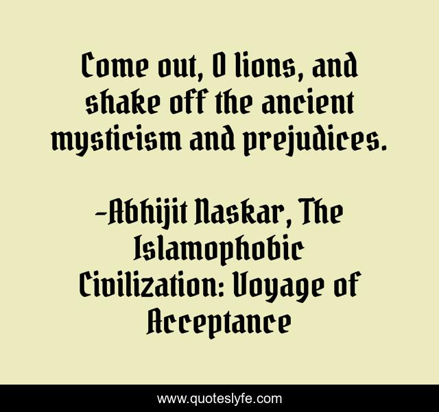 This page presents the quote "Come out, O lions, and shake off the ancient mysticism and prejudices.". Author of this quote is Abhijit Naskar, The Islamophobic Civilization: Voyage of Acceptance. This quote is about knowledge, science, inspirational, prejudices, youth, mysticism, truth, superstitions, enthusiasm,.