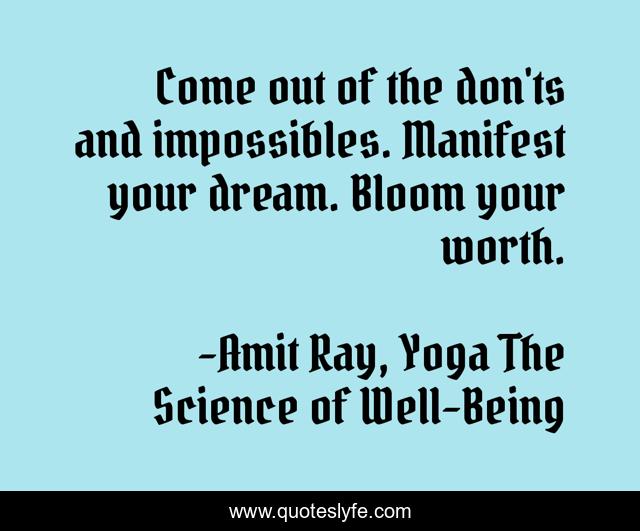 This page presents the quote "Come out of the don'ts and impossibles. Manifest your dream. Bloom your worth.". Author of this quote is Amit Ray, Yoga The Science of Well-Being. This quote is about business-success, success, bloom, dream-manifest, dreams-come-true, dreams, innovation, impossible, dreams-inspirational,.