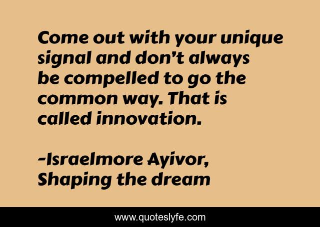 This page presents the quote "Come out with your unique signal and don’t always be compelled to go the common way. That is called innovation.". Author of this quote is Israelmore Ayivor, Shaping the dream. This quote is about food-for-thought, invention, new-things, compel, innovate, common-ways, common, common-name, innovation,.