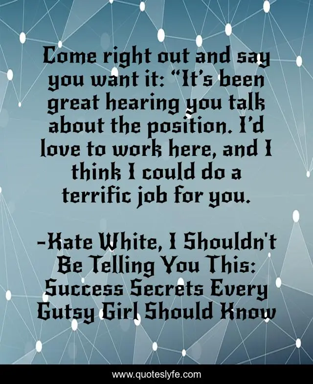 This page presents the quote "Come right out and say you want it: “It’s been great hearing you talk about the position. I’d love to work here, and I think I could do a terrific job for you.". Author of this quote is Kate White, I Shouldn't Be Telling You This: Success Secrets Every Gutsy Girl Should Know. This quote is about career, interviews, job-search,.