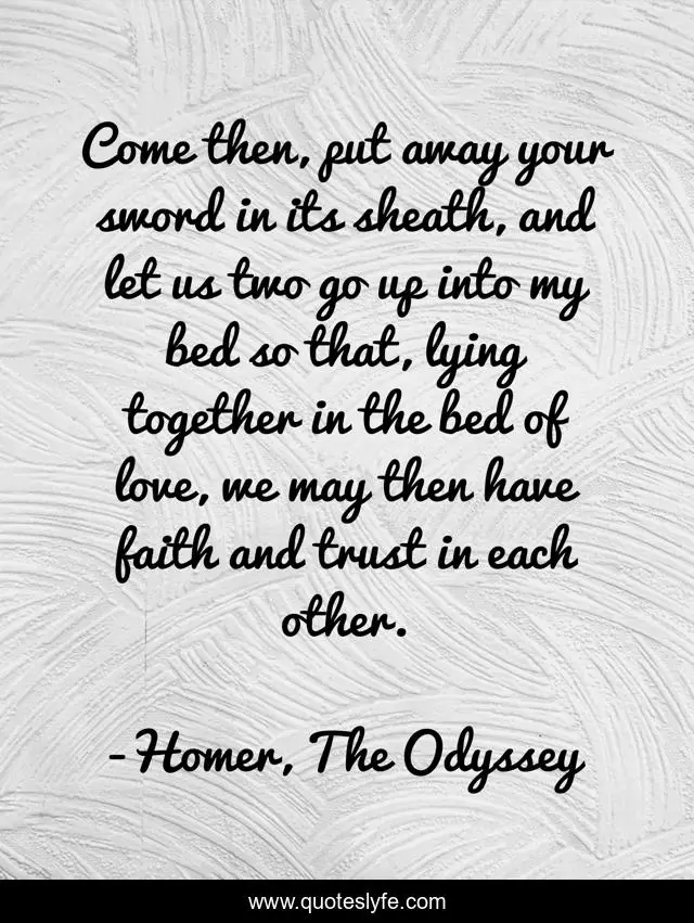 This page presents the quote "Come then, put away your sword in its sheath, and let us two go up into my bed so that, lying together in the bed of love, we may then have faith and trust in each other.". Author of this quote is Homer, The Odyssey. This quote is about love, peace, passion, greece, classics, affection,.