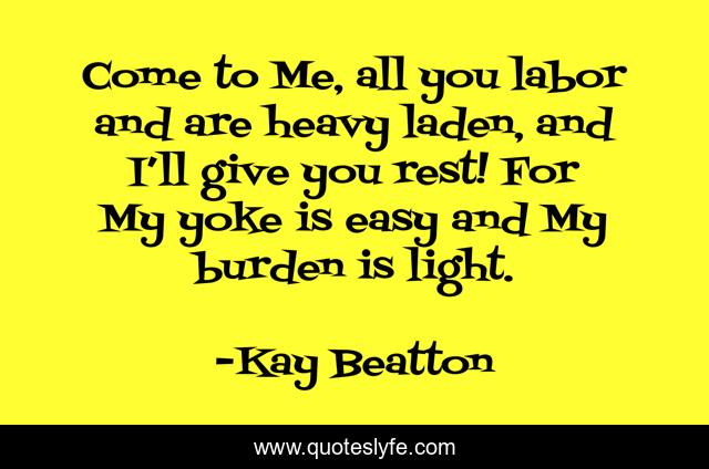 This page presents the quote "Come to Me, all you labor and are heavy laden, and I’ll give you rest! For My yoke is easy and My burden is light.". Author of this quote is Kay Beatton. .