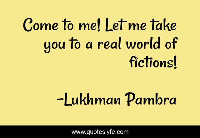 This page presents the quote "Come to me! Let me take you to a real world of fictions!". Author of this quote is Lukhman Pambra. This quote is about fantasy-romance, love, relationship, fiction, imagination, filmy, proposal, affection,.
