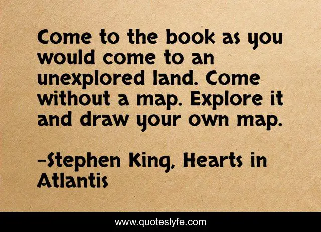 This page presents the quote "Come to the book as you would come to an unexplored land. Come without a map. Explore it and draw your own map.". Author of this quote is Stephen King, Hearts in Atlantis. This quote is about explore, book, reading,.
