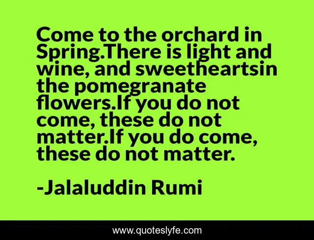 This page presents the quote "Come to the orchard in Spring.There is light and wine, and sweetheartsin the pomegranate flowers.If you do not come, these do not matter.If you do come, these do not matter.". Author of this quote is Jalaluddin Rumi. .