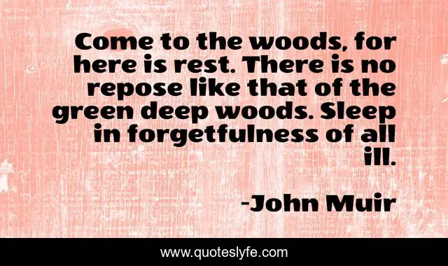 This page presents the quote "Come to the woods, for here is rest. There is no repose like that of the green deep woods. Sleep in forgetfulness of all ill.". Author of this quote is John Muir. This quote is about woods, forest, nature,.