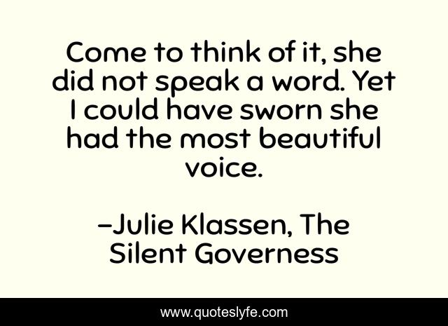 This page presents the quote "Come to think of it, she did not speak a word. Yet I could have sworn she had the most beautiful voice.". Author of this quote is Julie Klassen, The Silent Governess. This quote is about romance, humor,.