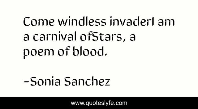 This page presents the quote "Come windless invaderI am a carnival ofStars, a poem of blood.". Author of this quote is Sonia Sanchez. This quote is about poetry, haiku,.