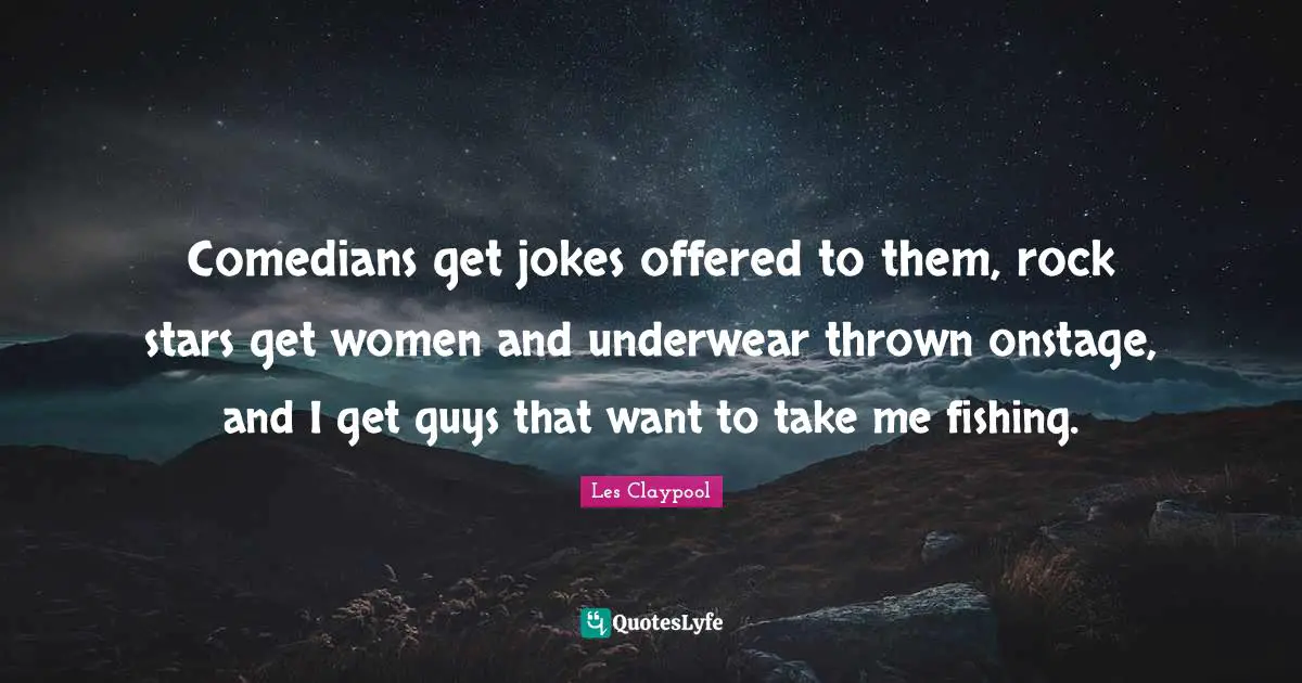 This page presents the quote "Comedians get jokes offered to them, rock stars get women and underwear thrown onstage, and I get guys that want to take me fishing.". Author of this quote is Les Claypool. This quote is about jokes, thrown, women, underwear, fishing, want, rocks, stars, take me,.