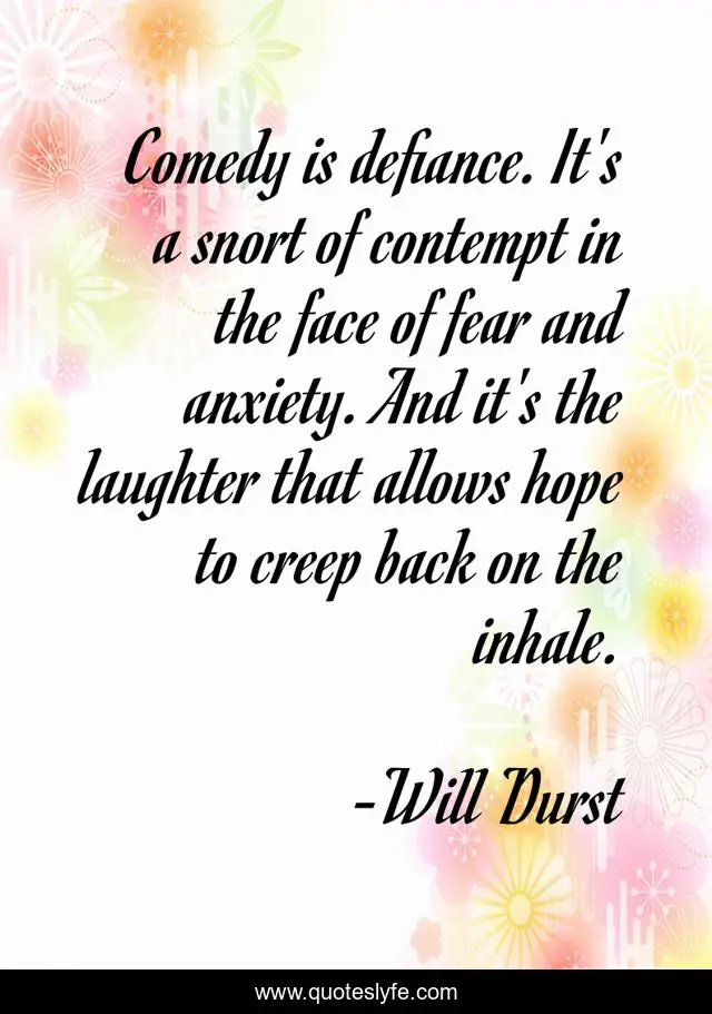 This page presents the quote "Comedy is defiance. It's a snort of contempt in the face of fear and anxiety. And it's the laughter that allows hope to creep back on the inhale.". Author of this quote is Will Durst. This quote is about fear, anxiety, laughter,.