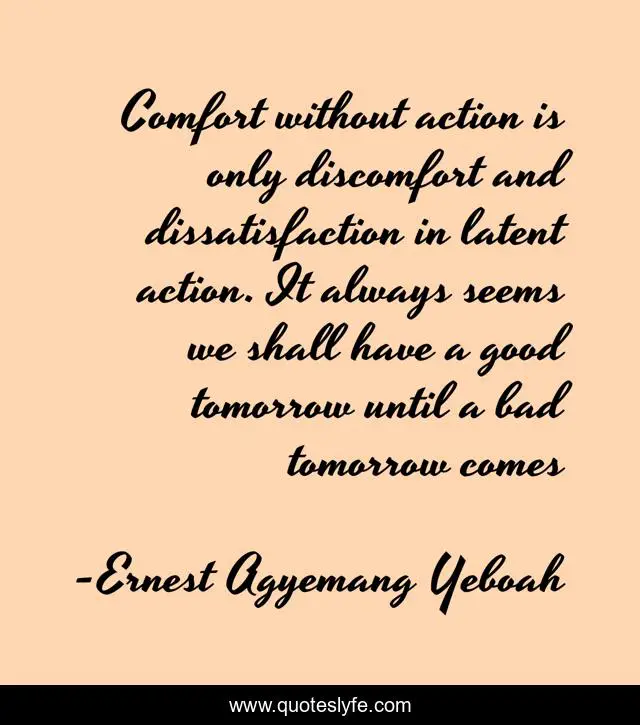 This page presents the quote "Comfort without action is only discomfort and dissatisfaction in latent action. It always seems we shall have a good tomorrow until a bad tomorrow comes". Author of this quote is Ernest Agyemang Yeboah. This quote is about mind-today, life, comfortable-life, tomorrow, comfort, uncertainties-in-life, living-in-comfort, thought, discomfort,.