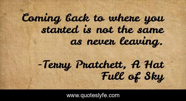 This page presents the quote "Coming back to where you started is not the same as never leaving.". Author of this quote is Terry Pratchett, A Hat Full of Sky. This quote is about hat, full, pratchett, sky, terry,.