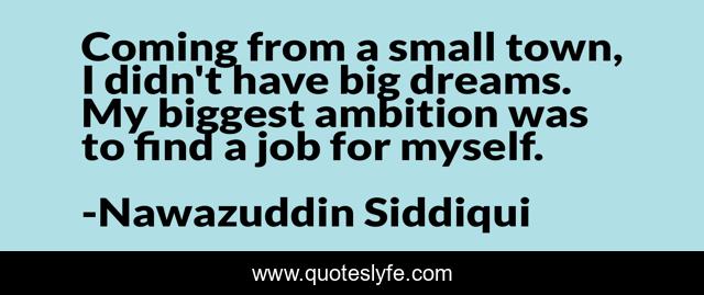 This page presents the quote "Coming from a small town, I didn't have big dreams. My biggest ambition was to find a job for myself.". Author of this quote is Nawazuddin Siddiqui. This quote is about myself, job, ambition,.