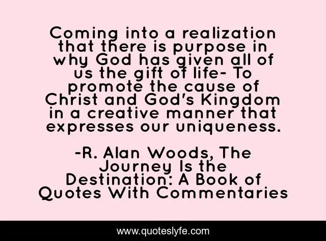 This page presents the quote "Coming into a realization that there is purpose in why God has given all of us the gift of life- To promote the cause of Christ and God's Kingdom in a creative manner that expresses our uniqueness.". Author of this quote is R. Alan Woods, The Journey Is the Destination: A Book of Quotes With Commentaries. This quote is about creativity-work, purpose-of-life, uniqueness, purpose-driven, r-alan-woods, purpose-of-living,.