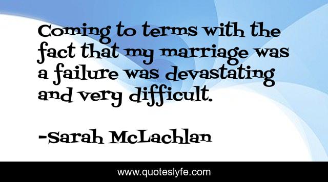 This page presents the quote "Coming to terms with the fact that my marriage was a failure was devastating and very difficult.". Author of this quote is Sarah McLachlan. This quote is about marriage, fact, difficult,.