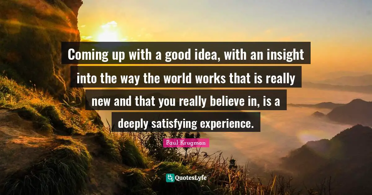 This page presents the quote "Coming up with a good idea, with an insight into the way the world works that is really new and that you really believe in, is a deeply satisfying experience.". Author of this quote is Paul Krugman. This quote is about way, insight, satisfying, believe, ideas, experience, world,.