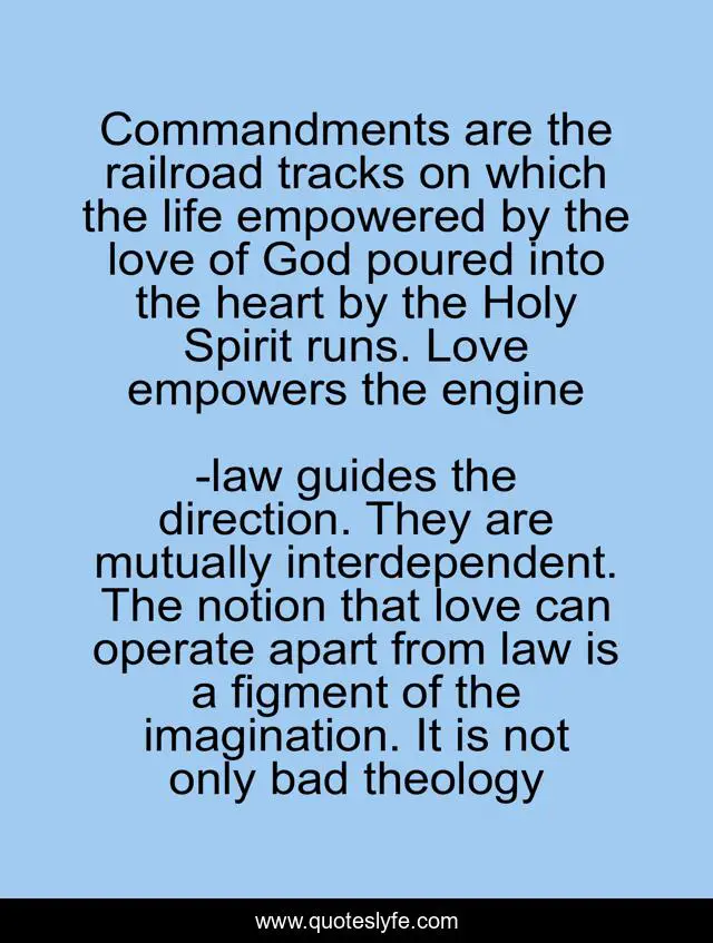 This page presents the quote "Commandments are the railroad tracks on which the life empowered by the love of God poured into the heart by the Holy Spirit runs. Love empowers the engine". Author of this quote is law guides the direction. They are mutually interdependent. The notion that love can operate apart from law is a figment of the imagination. It is not only bad theology. .