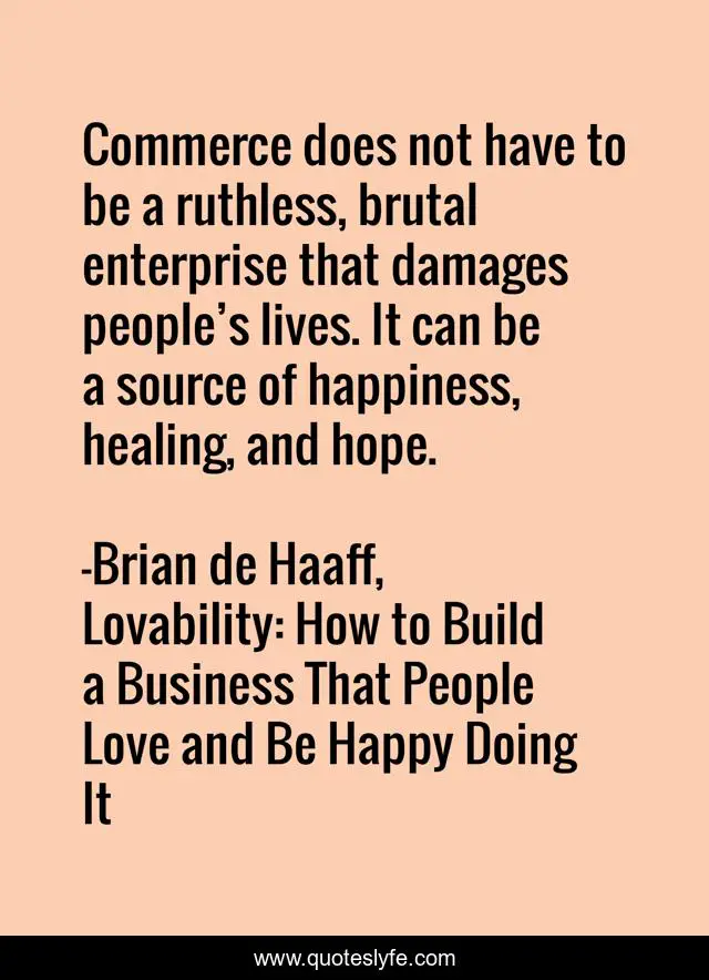 This page presents the quote "Commerce does not have to be a ruthless, brutal enterprise that damages people’s lives. It can be a source of happiness, healing, and hope.". Author of this quote is Brian de Haaff, Lovability: How to Build a Business That People Love and Be Happy Doing It. This quote is about leadership, product-management, business,.