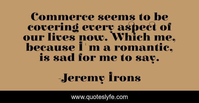 This page presents the quote "Commerce seems to be covering every aspect of our lives now. Which me, because I'm a romantic, is sad for me to say.". Author of this quote is Jeremy Irons. This quote is about me, romantic,.