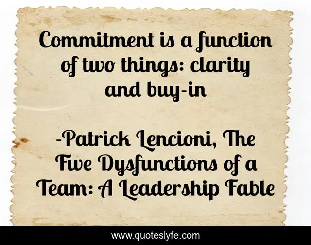 This page presents the quote "Commitment is a function of two things: clarity and buy-in". Author of this quote is Patrick Lencioni, The Five Dysfunctions of a Team: A Leadership Fable. This quote is about clarity, commitment,.