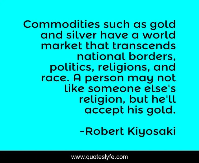 This page presents the quote "Commodities such as gold and silver have a world market that transcends national borders, politics, religions, and race. A person may not like someone else's religion, but he'll accept his gold.". Author of this quote is Robert Kiyosaki. This quote is about politics, gold, world,.