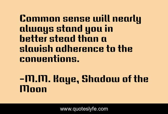 This page presents the quote "Common sense will nearly always stand you in better stead than a slavish adherence to the conventions.". Author of this quote is M.M. Kaye, Shadow of the Moon. This quote is about common-sense, m-m-kaye, advice, wisdom,.