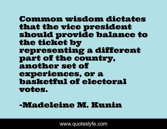 This page presents the quote "Common wisdom dictates that the vice president should provide balance to the ticket by representing a different part of the country, another set of experiences, or a basketful of electoral votes.". Author of this quote is Madeleine M. Kunin. This quote is about country, balance, president,.