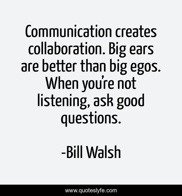 This page presents the quote "Communication creates collaboration. Big ears are better than big egos. When you’re not listening, ask good questions.". Author of this quote is Bill Walsh. This quote is about communication, listening, questions,.