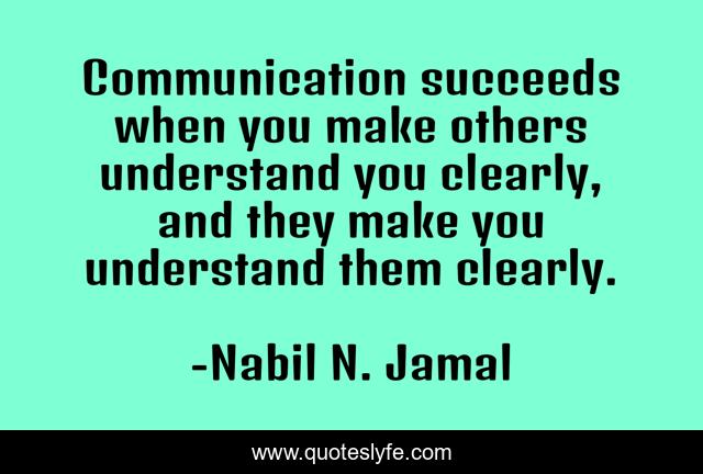This page presents the quote "Communication succeeds when you make others understand you clearly, and they make you understand them clearly.". Author of this quote is Nabil N. Jamal. This quote is about nabil-n-jamal, success, communication, communicate, succeed, understand, they, nabil-jamal, jamal,.